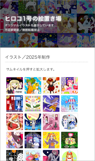 そんな私のイラストサイト(モバイル版)は、以下のような見た目になっています。
